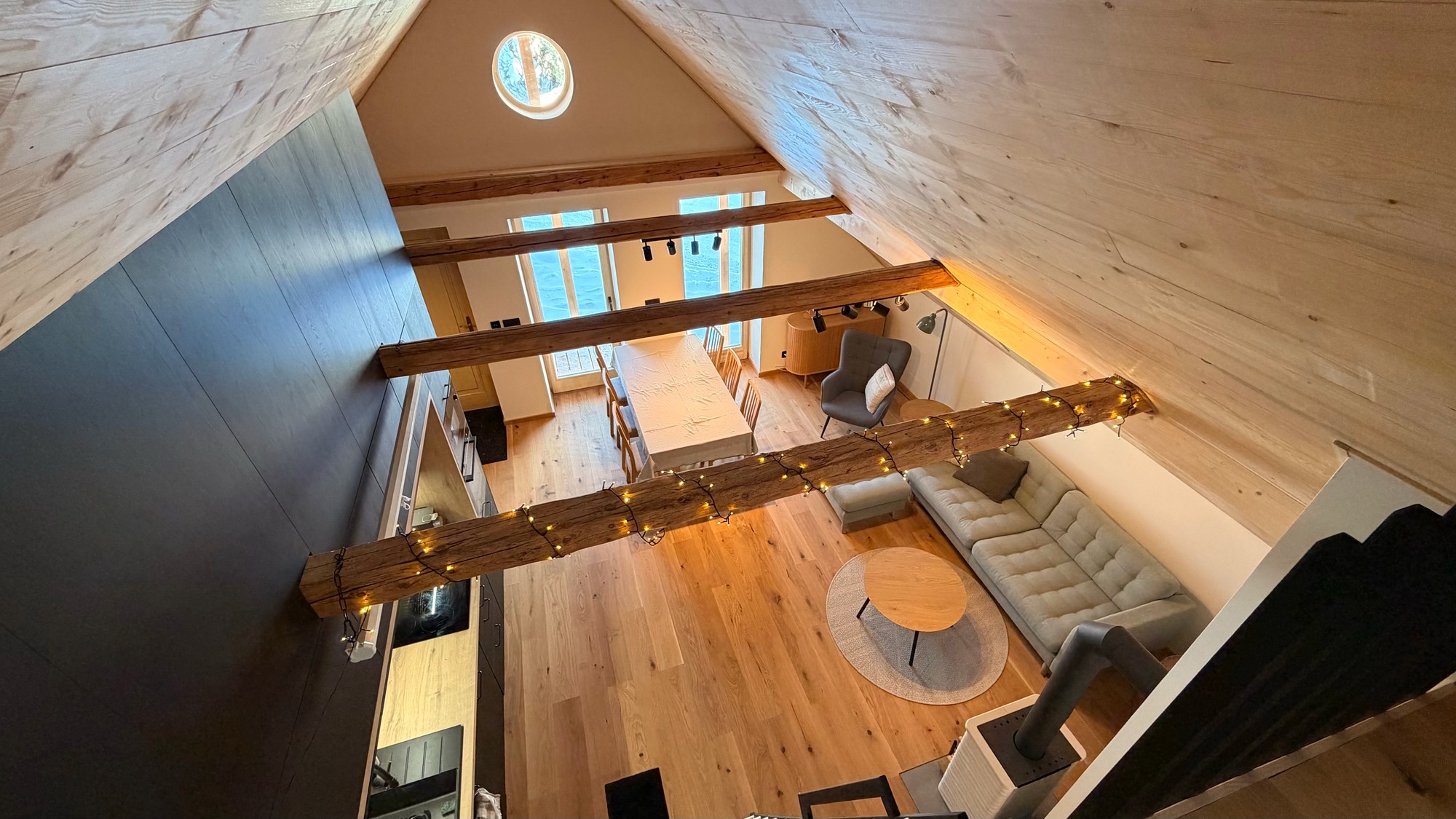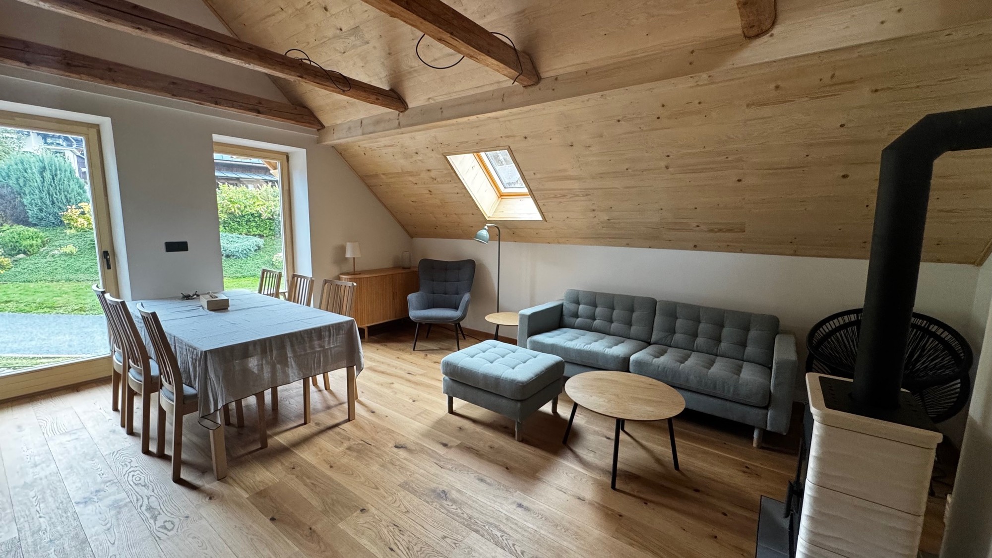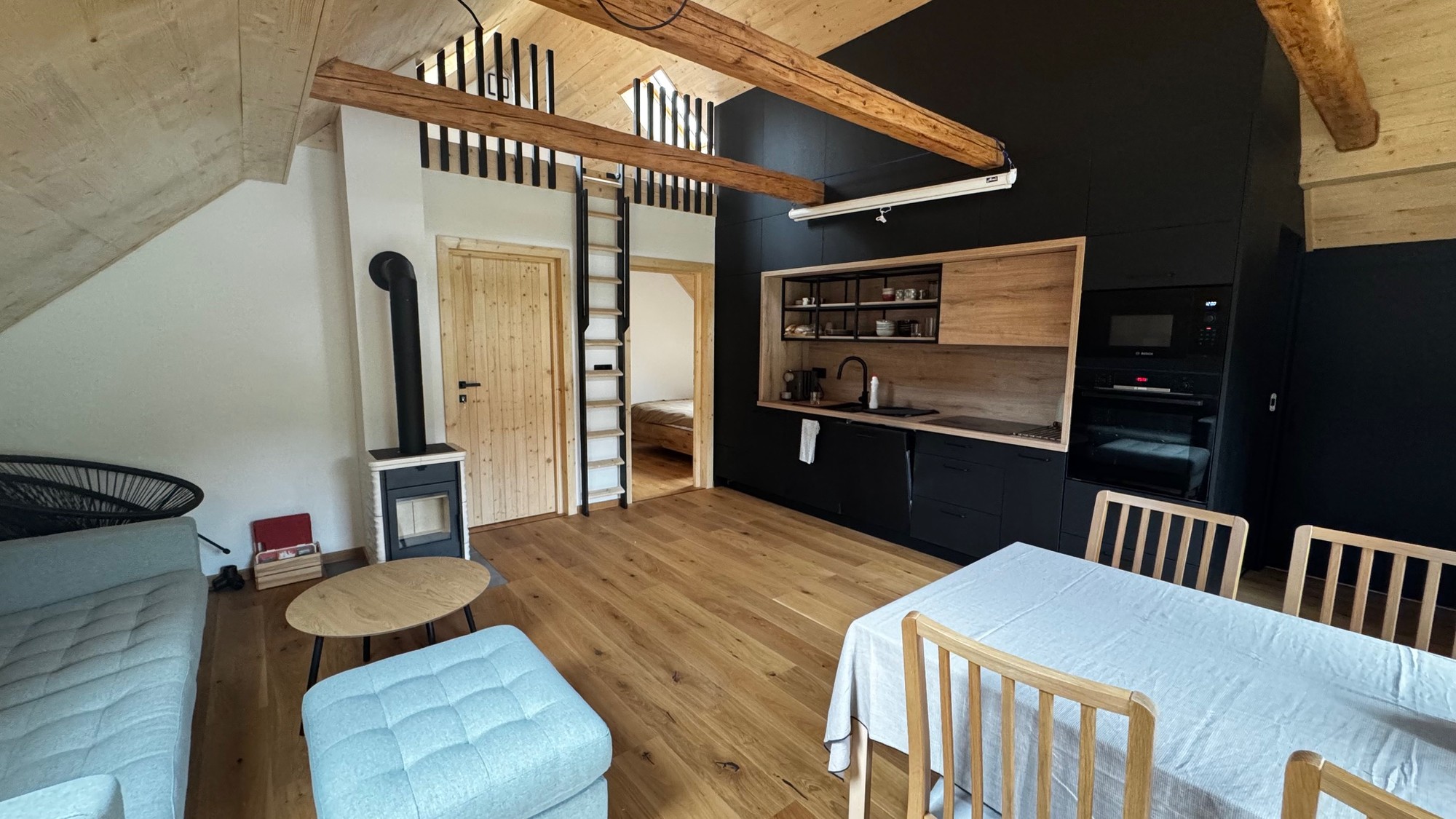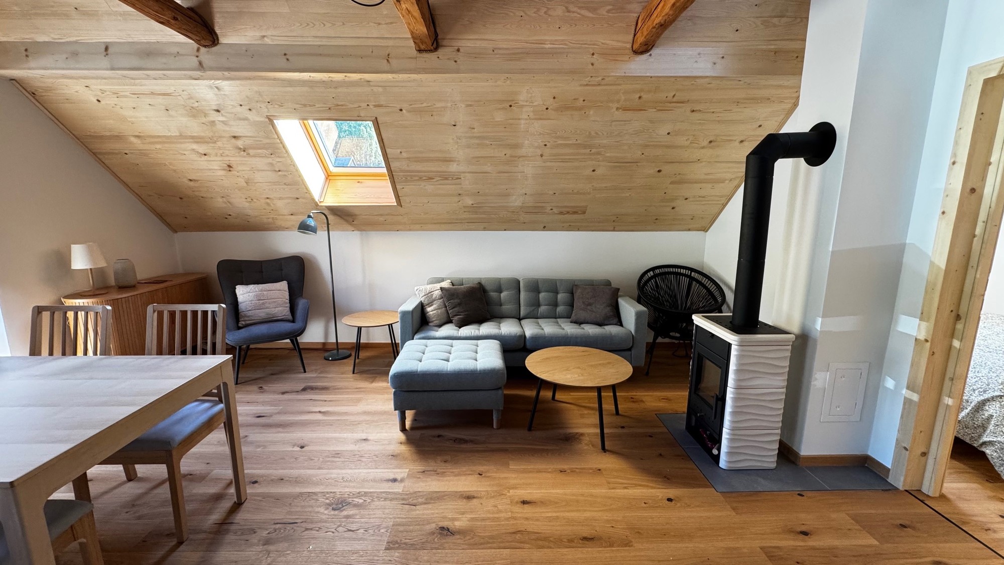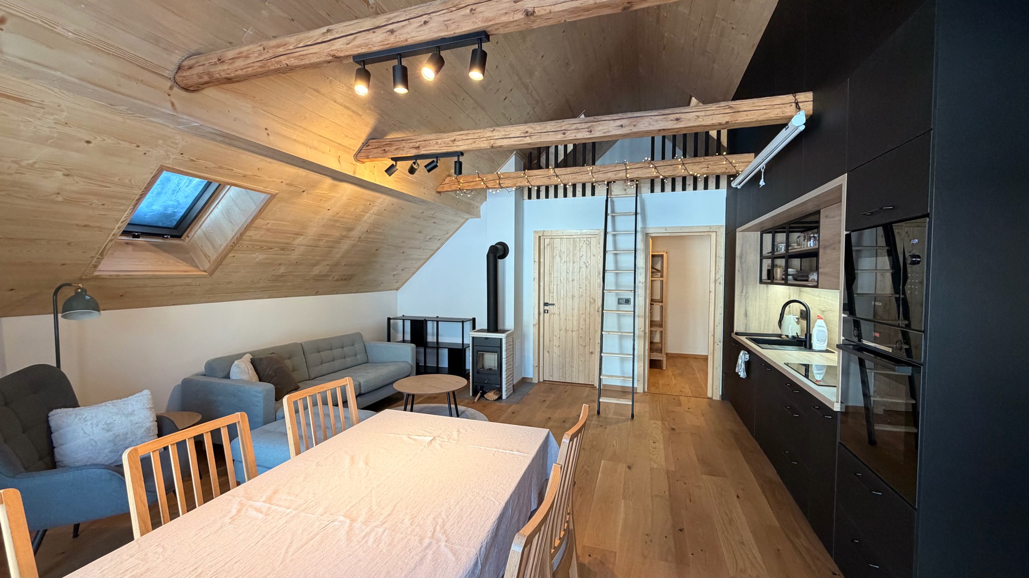 Apartmán pod střechou je moderní podkrovní byt s unikátní atmosférou. Dřevěné trámy, velká okna s výhledem do zeleně a promyšlený design vytvářejí prostor, kde se budete cítit jako doma.