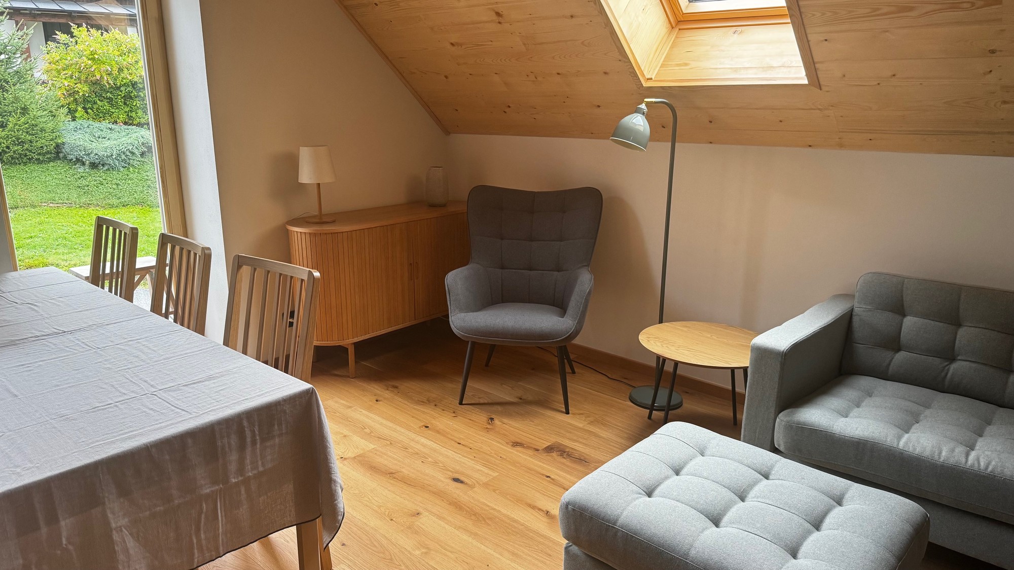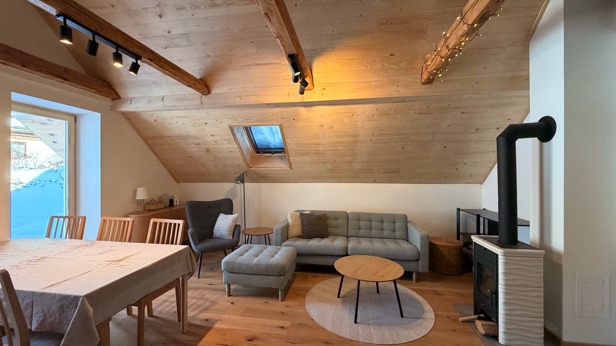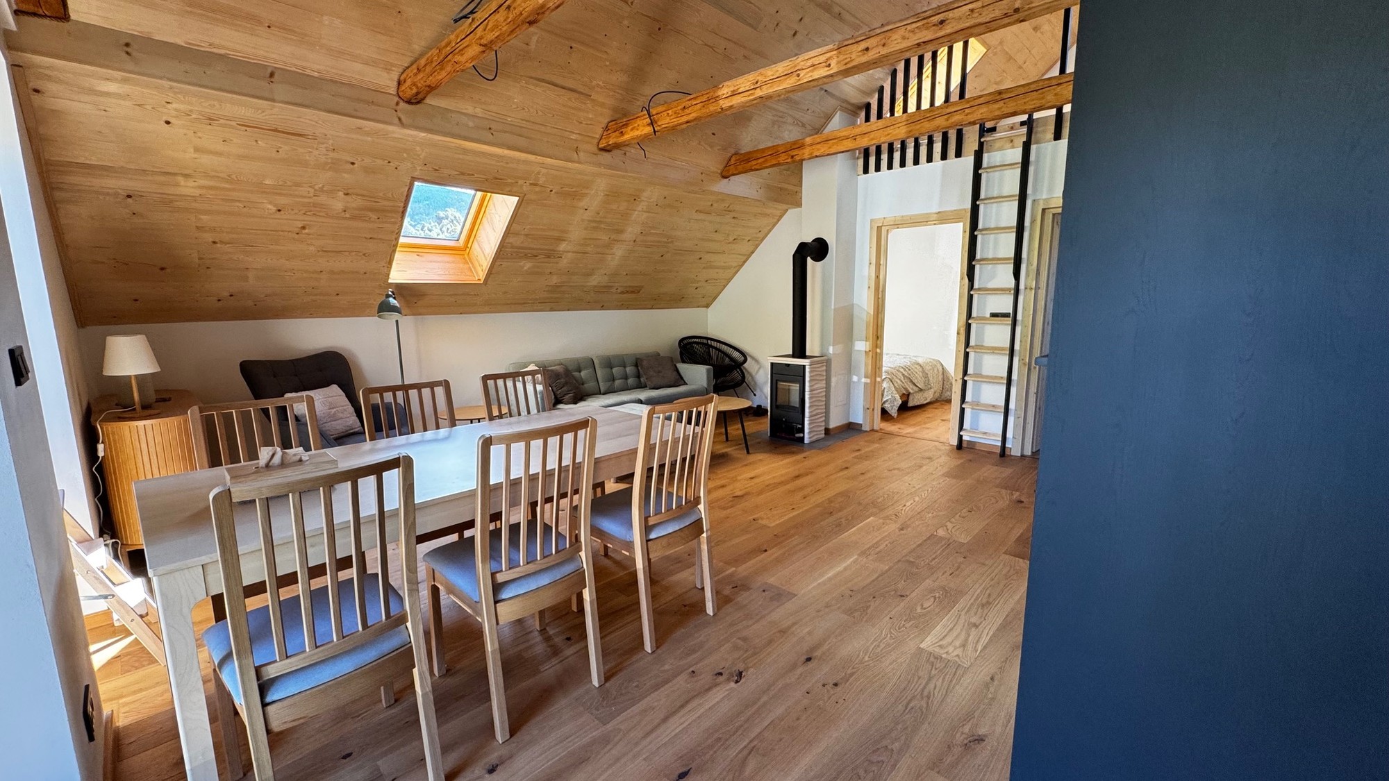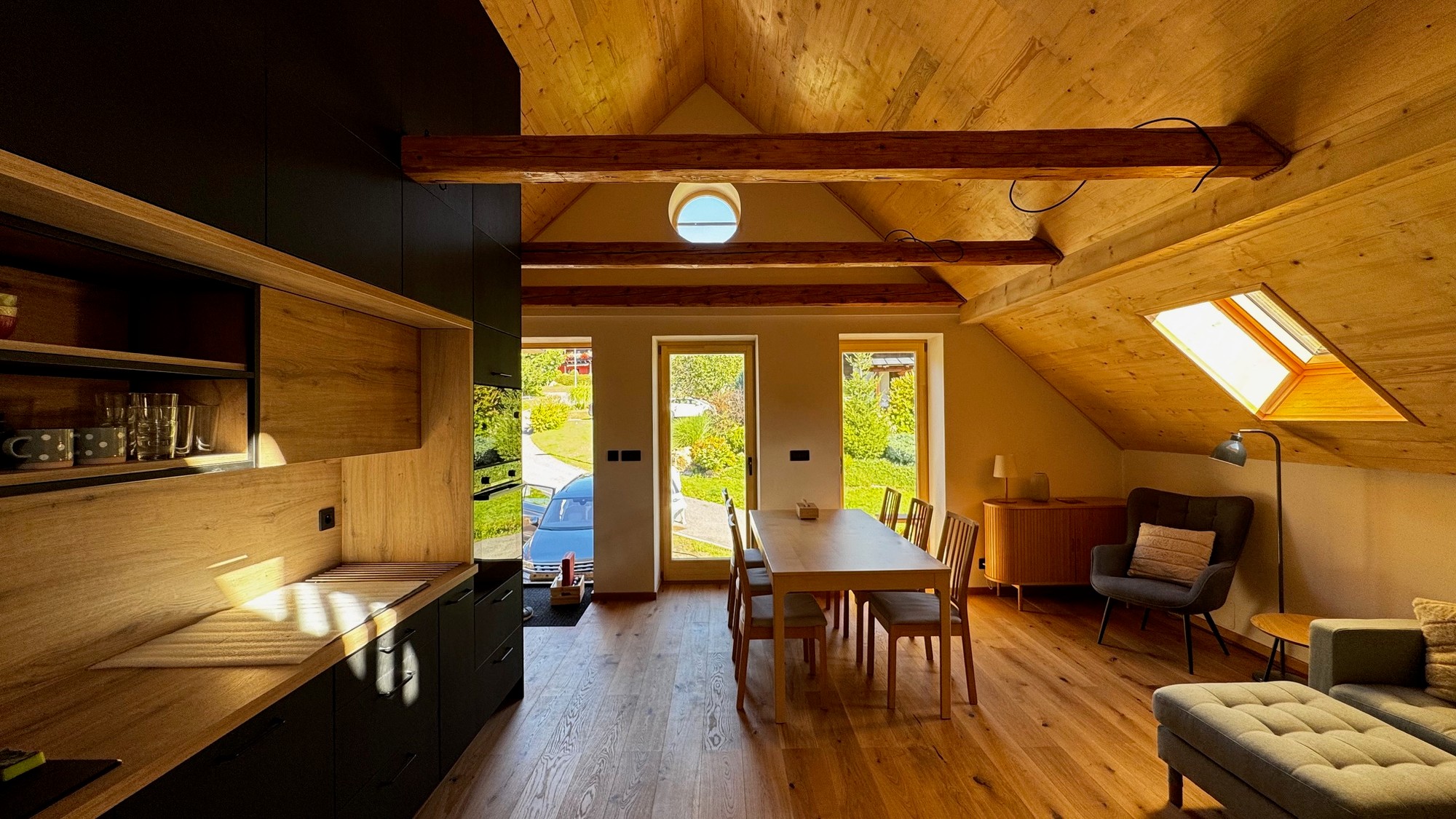 Apartmán pod střechou je moderní podkrovní byt s unikátní atmosférou. Dřevěné trámy, velká okna s výhledem do zeleně a promyšlený design vytvářejí prostor, kde se budete cítit jako doma.